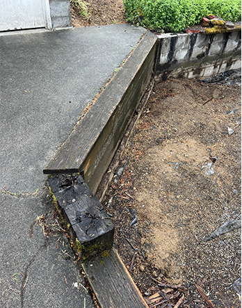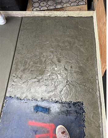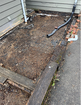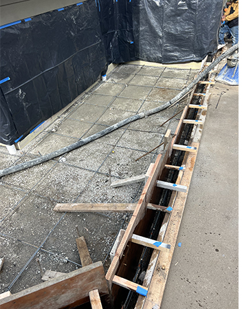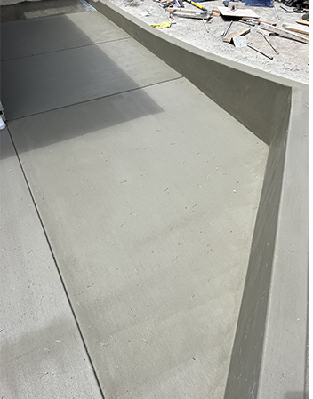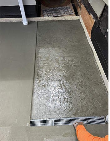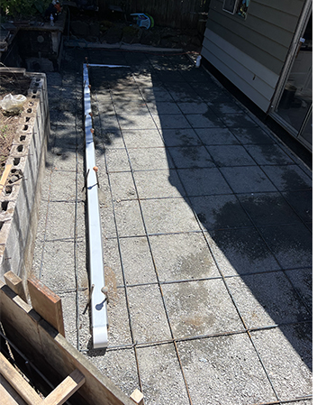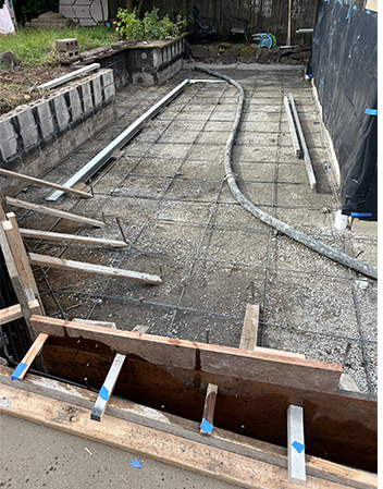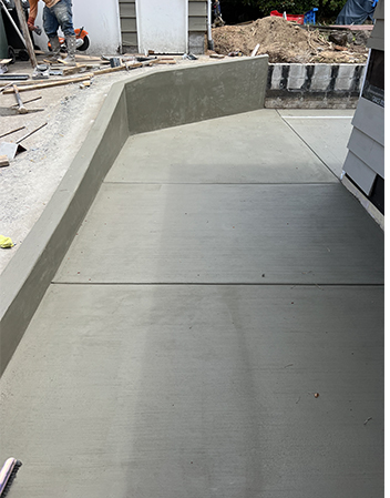 Broom finish patio, decorative walkway, retaining wall and drainage system