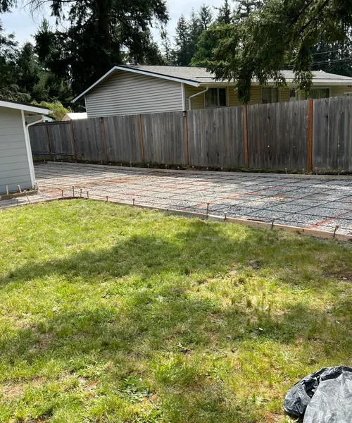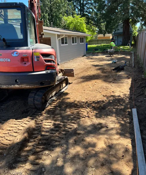Broom finish driveway with decorative smooth finish borders, exposed aggregate walkway